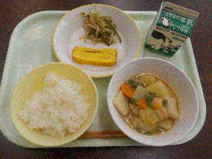 今日の献立は、ごはん、牛乳、厚焼き卵、茎わかめのごま酢和え、関東だきでした。