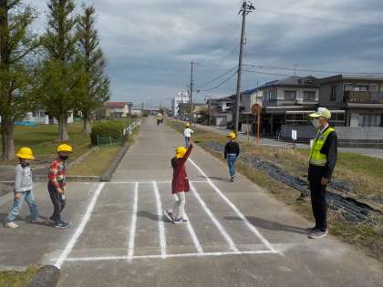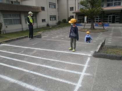 交通安全協会広田支部長の力示さんに見ていただきながら、自分で安全を確認して横断歩道を渡りました。
