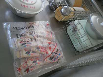 今日の給食は、1年生の入学をお祝いする献立でした。デザートのクレープの袋には、調理員さんたちからの「ごにゅうがくおめでとうございます」のメッセージ!