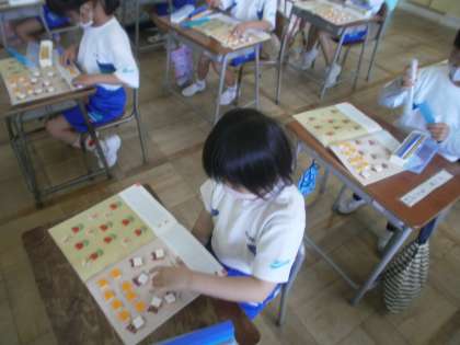 今日は、ブロックを使って勉強しました。教科書のイラストの上にブロックを置き、それを並べ替えて、どちらが多いか考えました。置き忘れないように気を付けたり、きちんとそろえて並べたりしながら、よく考えていました。