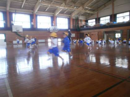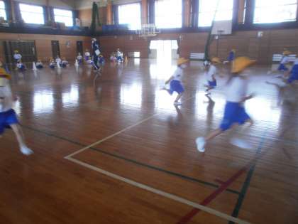 体育の授業で、元気に体を動かしました。大きくスキップしたり、まっすぐ走ったりして、たくさん汗をかきました。コースの先にあるコーンを目指して、みんなとても力強く走っていました。
