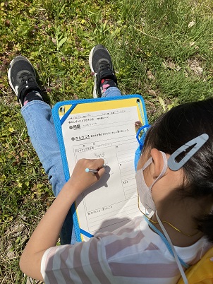 春の自然を探しに広田の森へ行っている様子です。虫眼鏡で観察しています。