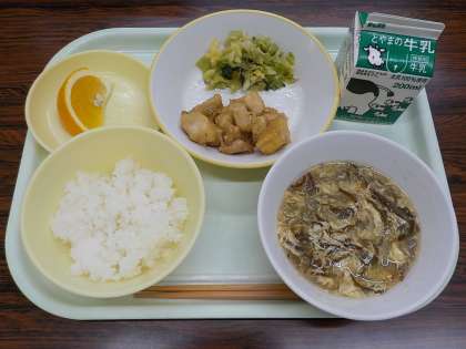 今日の献立は、ごはん、牛乳、鶏肉と高野豆腐のねぎソースかけ、チンゲンサイひたし、卵ともずくのスープ、サンフルーツです。