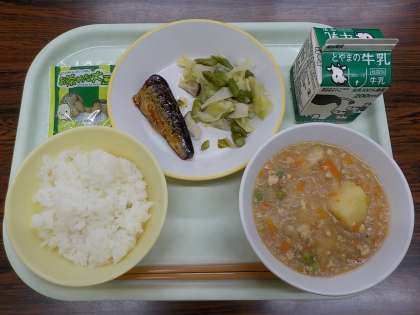 今日の献立は、ごはん、牛乳、いわしの生姜味、野菜ソテー、じゃがいものそぼろ煮、抹茶大豆でした。