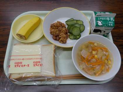 今日の献立は、食パン、牛乳、チリコンカン、きゅうりもみ、キャベツスープ、バナナ、スチーズチーズ でした。