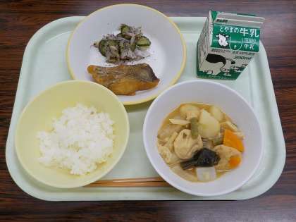 今日の献立は、ごはん、牛乳、魚のスタミナ揚げ、ゆかり和え、炊き合わせでした。