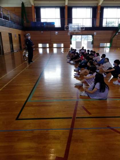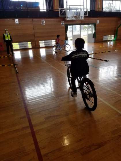 クラスで交通安全についての映像を視聴したあとに、体育館で実際に自転車に乗り、道路での安全な運転の仕方を学びました。地域の方や警察の方に教えていただいことを忘れず、日ごろから安全運転に心がけてほしいと思います。