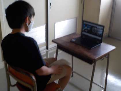 友達の自己紹介文を聞きながら、自分の紹介文をより膨らませました。発表は、教室外に設置されたPCを海外に見立て、日本とテレビ電話でつながっている設定です。