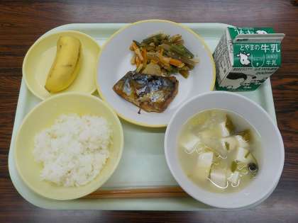 今日の献立は、ごはん、牛乳、さばの照焼き、茎わかめのきんぴら、豆腐のみそ汁、バナナでした。