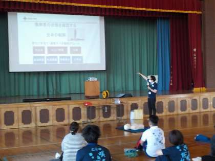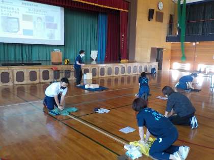 赤十字救急法指導員の方に来ていただき、心臓マッサージのやり方やAEDの使い方等の実技指導を受けました。熱中症や水泳の事故等から子供たちの命や身の安全を守るために、全教職員で真剣に学びました。