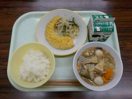 今日の献立は、ごはん、牛乳、八宝菜、かぼちゃ天ぷら、甘酢和えでした。