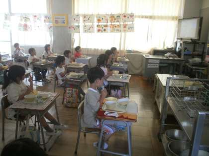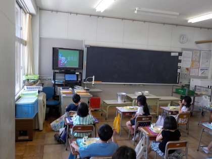 歯科検診に向けて、歯を磨く大切さや正しい歯磨きの仕方をビデオで学びました。給食を食べ終わった子供たちは、さっそくビデオで学んだ歯磨きを実践していました。