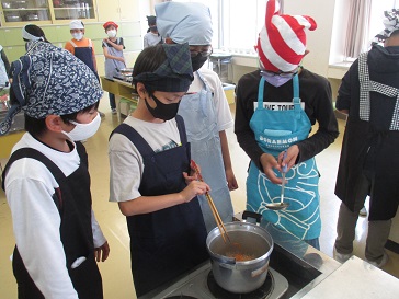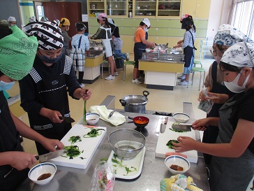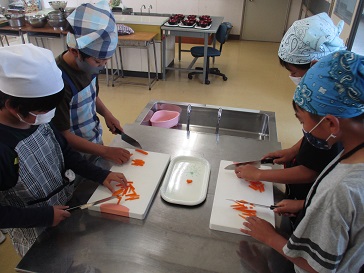 5年生になって、初めての家庭科での調理実習です。にんじんを包丁で短冊切りにしたり、水を沸騰させて柔らかくしたりする際、「家で料理の手伝いをしているから、包丁も使えるよ」「鍋にどのくらいの水を入れて沸騰させれば、にんじんがやわらかくなるかな」など、日頃の生活体験と関わらせながら調理を進めることができました。