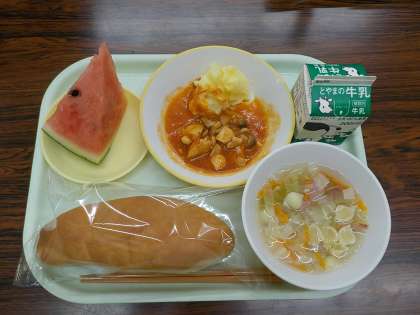 今日の献立は、コッペパン、牛乳、鶏肉のトマト炒め、チーズポテト、マカロニスープ、すいかでした。