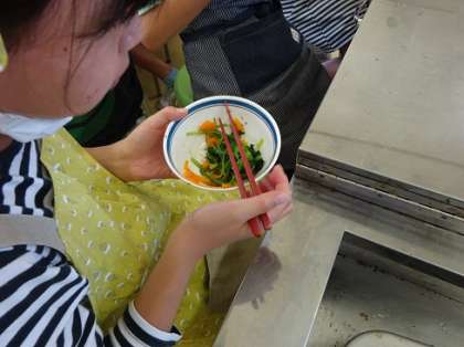 2種類の野菜をゆで、計量スプーンで調味料を量り、味をつけました。そしていよいよ試食です。「素材の味がする」「味付けもちょうどいい」「もう少しにんじんをゆでれば柔らかくなったかな」など、様々な感想を持ちながら味わって食べました。手際よく、協力して片付けを終え、大満足の表情でした。