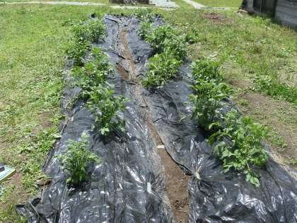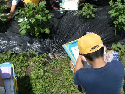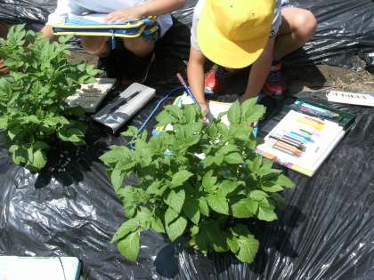 畑でみんなで育てており、植えてから1か月ほど経ちましたが、とても大きくなりました。ジャガイモの葉の大きさや背丈を算数科の長さの学習を生かしてものさしで測ったり、このあとの生長の様子を友達と予想したりするなど、「もっと大きくなって、おいしいじゃがいもを食べたいな」と楽しみにする子供たちの姿が見られました。