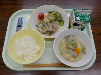 今日の献立は、ごはん、牛乳、豚肉の塩こうじ炒め、かぶの色どり、ミニトマト、すいとん、のり佃煮でした。