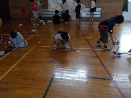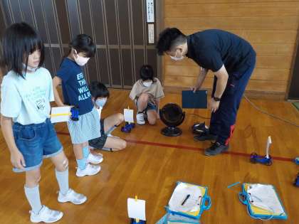 理科の時間は、「風の力で車を動かそう」の学習です。下敷きであおいで車を動かそうと、横に縦に力一杯あおぎますが、うまく進みません。そこで、画用紙の帆を付けてみました。みるみる進むので「やったあ、1メートル50センチ!」とうれしそうに進んだ距離を測ります。次に、先生が用意した送風機を使ってみることにしました。風量を弱→中→強と変えながら車の帆に当ててみました。強にしたときには、「すごい。3メートルを超えた!」と歓声があがりました。