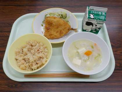 今日の献立は、五目ごはん、牛乳、アジフライ、きざみ和え、うち豆汁です。