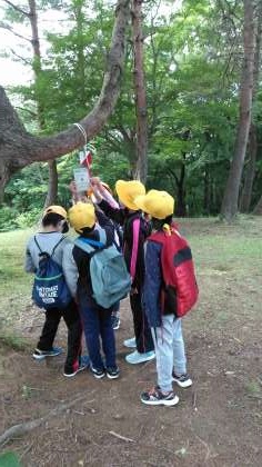 班のみんなで、地図をみながらポストを見付けます。「あったよ。」森の中に、うれしそうな声が響きます。ポストの裏にはクイズがあるので、知恵を出し合って解答します。