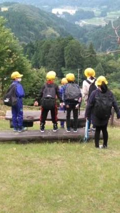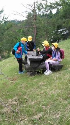 疲れてきたら、しばし休憩。見晴台からは、富山市の町並みや富山湾が一望てきます。「ヤッホー「きれい、石川県見えるよ。」