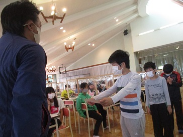 子どもの村2日目です。いい天気になりました。6時に起床し、仲間と協力してシーツをたたんだり、ふとんを片付けたりしました。「来た時よりも美しく」、部屋の清掃も丁寧にできました。朝食時には、昨日の村内オリエンテーリングの得点上位3チームへの表彰も行いました。