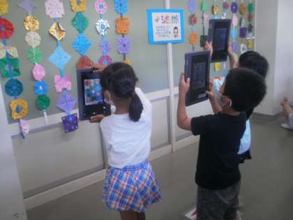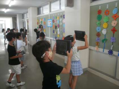 家の人に見てもらおうと、自分のクロムブックで作品の写真を撮りました。「縦にしようかな」「たくさん撮って、見せたいな」とうれしそうでした。