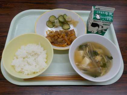今日の献立は、ごはん、牛乳、魚の野菜あんからめ、華風和え、豆腐スープです。