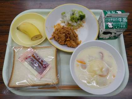 今日の献立は、食パン、牛乳、ポークチャップ、そえ野菜、かぶのシチュー、バナナ、メープルジャムでした。