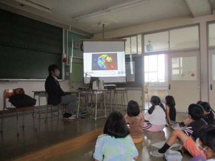 社会科の授業で環境問題について学習しました。地球温暖化が進むとどうなるのか、地球温暖化を止めるためにはどうしたらいいのかについて講師の方に教えていただき、学びを深めました。
