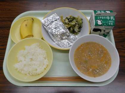 今日の献立は、ごはん、牛乳、さばの銀紙焼き、ごま和え、冬瓜のそぼろあん、バナナでした。