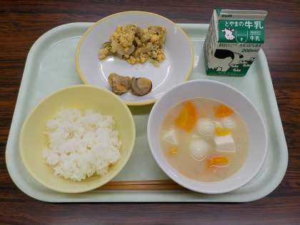 今日の献立は、ごはん、牛乳、ほたての香味焼き、ゴーヤの卵炒め、白玉汁でした。