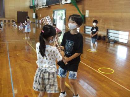 広田校区の防犯パトロール隊長の福田さんのご厚意で、聖火ランナーのトーチを持たせていただきました。実際に持って走ってみると、「予想よりも軽い」とつぶやく子が多かったです。本物に触れることで、「いつか聖火ランナーになって走ってみたいな」と思う子や「トーチを持って走ると気持ちよかった」と感じる子がいました。本物を目の前に興味津々の子供たちでした。