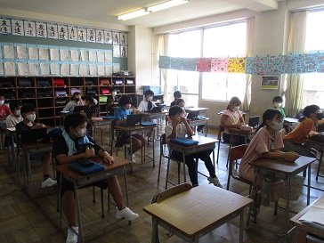 5年生の夏休みの課題のひとつに、クロムブックでニュース記事をまとめる課題があります。東京オリンピックや新型コロナウイルス感染症の感染拡大のこと、天気や災害のことなど、自分なりに事実と感想をまとめて紹介し合いました。登校日の様子についても記事にあげるなど、クロムブックの使い方にもどんどん慣れてきた5年生です。