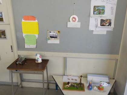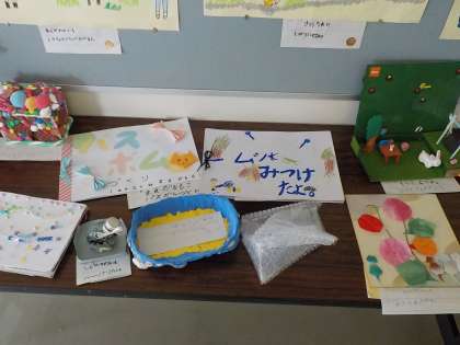 教室の廊下に、工作や調べ学習など、夏休みに子供たちが頑張って作った作品を展示しました。友達の作品に興味津々の様子で、仲良く見合っていました。