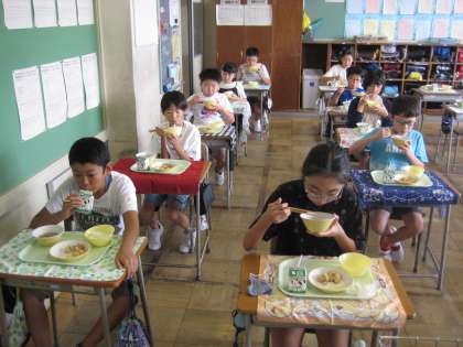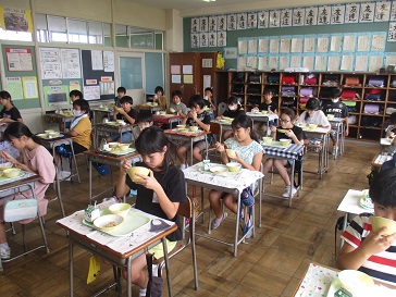 2学期の給食がスタートしました。新型コロナウイルス感染症対策のため、1学期に引き続き、黙って食べる「黙食」を行っています。集中して食べるので、残食も減ってきました。これからも、おいしくいただきましょう。
