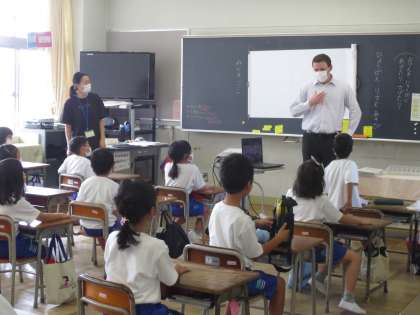 本日より、ALTのマーク先生が来てくださいました。1年生の教室に飛び入りで自己紹介をしに入ってくださいました。「ぼくの得意技は、片手で拍手ができることです」先生も子供もびっくり仰天でした。
