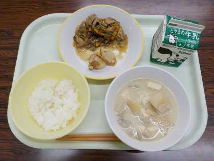 今日の献立は、ごはん、牛乳、ほたての香味焼き、もずくのチャプチェ、ごまけんちんでした。