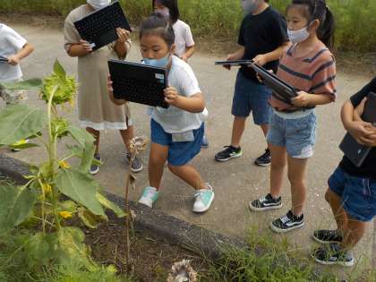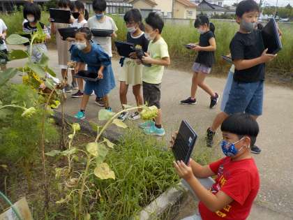 1学期に種を蒔いて育てていたヒマワリが大きくなりました。花や実の様子をクロムブックで記録しています。