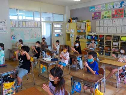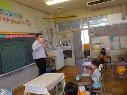 今日、ALTのマーク先生が1年生、2年生の部屋に来てくださいました。普段、外国語活動や外国語科の学習がない子供たちは、マーク先生との出会いに目を輝かせていました。