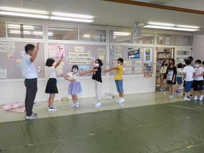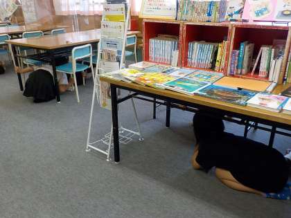 富山県のシェイクアウト訓練(地震発生直後の身を守る行動を身につける訓練)に参加しました。低学年は、教室での地震発生時の動きを身に付ける、3年生以上は、体育館、図書室等、物が倒れてきたり落ちてきたりすることを想定した場所での訓練を行いました。これは、図書室での4年生の様子です。