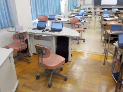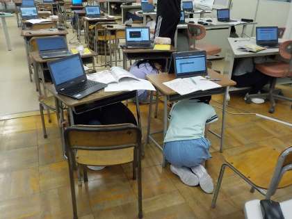 これは、コンピュータ室の様子です。5年生が訓練をしていました。机の大きさが様々なので、頭を守ってじっとしているのは大変そうです。