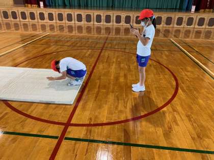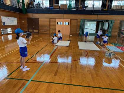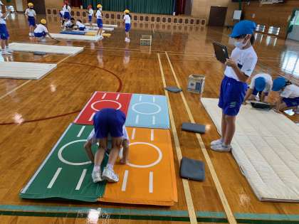 マット運動で前転と後転の練習をしました。友達に撮ってもらった動画を見ながら振り返る時間を確保し、さらに上達を目指しています。