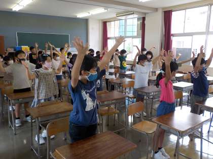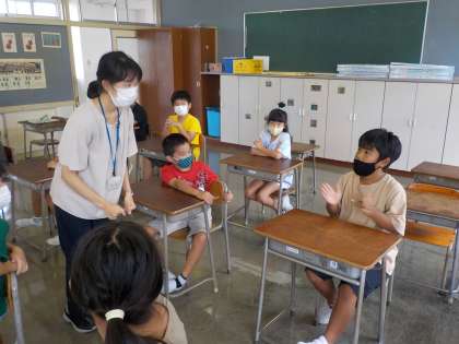 久しぶりの音楽の授業です。曲や音に合わせて、動いたり手拍子をしたりしています。子供たちの耳とリズム感のよさに感心しました。
