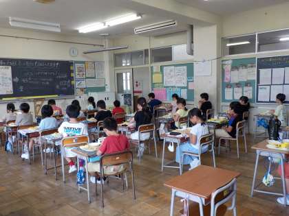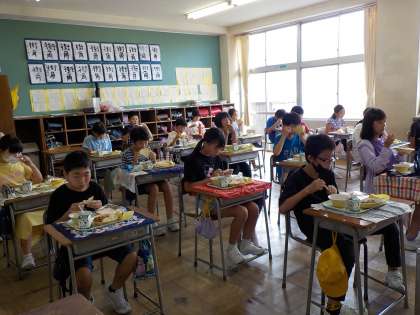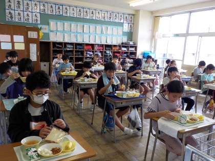 3年生、5年生、6年生の様子です。マスクを外すときに「ふうっ」と誰かがため息をつきました。子供たちもよくがんばっているのだなと感じました。どの学級でも黙食です。お食事のおいしさが子供たちの心を和ませてくれます。
