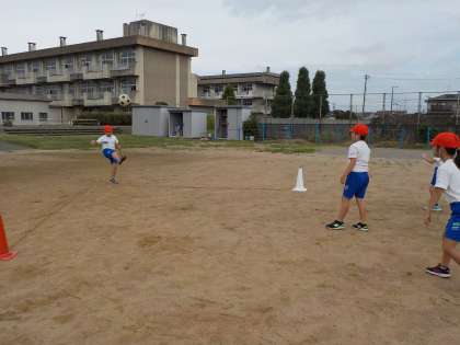 色団に分かれて練習しました。「転がってくるボールを蹴るのって意外と難しいね」「助走をして蹴れば、ボールがよく飛ぶよ」と、よく考えながら練習していました。