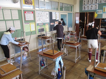 2学期最初の清掃が始まりました。コロナウイルス感染症対策も兼ねて、黙働清掃です。もくもく集中して掃除をすると、教室もきれいになりました。