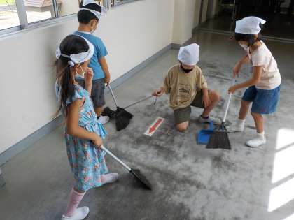 今週から清掃活動が始まりました。子供たちはしっかり三角巾をつけて、黙動に取り組んでいます。ピカピカに清掃すると、とっても気持ちがいいですね。