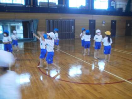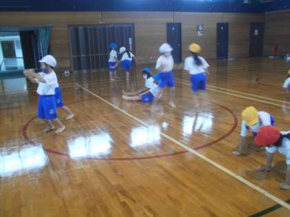 今日の体育は、大好きな表現遊びです。ライオンやカメ、ぞう、ゴリラなど、いろいろな動物になりきって、夢中になって体を動かしています。
