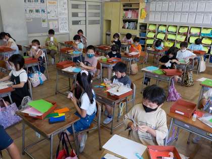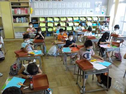 図画工作科の学習では、コロコロと紙皿が転がり、絵が変わっていくおもちゃを作っています。「私は宇宙をつくって星が流れるようにしたい。」「ぼくは海にして魚が泳いでいるようにするよ。」と、それぞれ自分の好きなテーマに合わせて紙を切り、コロコロおもちゃを作っていました。